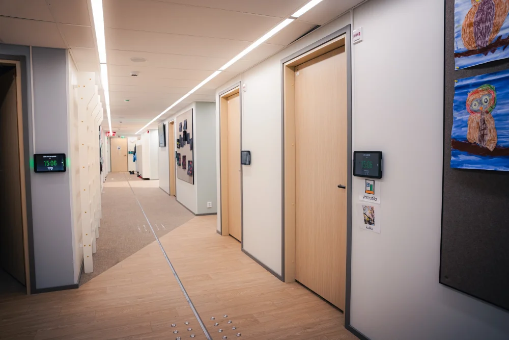 Kohteeseen toimitettiin Eduxin kerrostaso-ovia ja väliovia useissa eri laminaattikuoseissa sekä saarniviilupintaisina. Erilaiset pintavaihtoehdot tuovat tiloihin lämpimän, viihtyisän ilmeen, joka tukee koulun toiminnalle tärkeää turvallista ja inspiroivaa oppimisympäristöä.