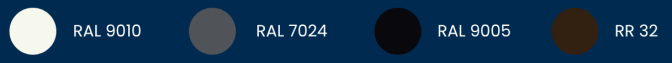 • Alumiinien vakiovärit: valkoinen RAL 9010, tummanharmaa RAL 7024, musta RAL 9005, tummanruskea RR 32